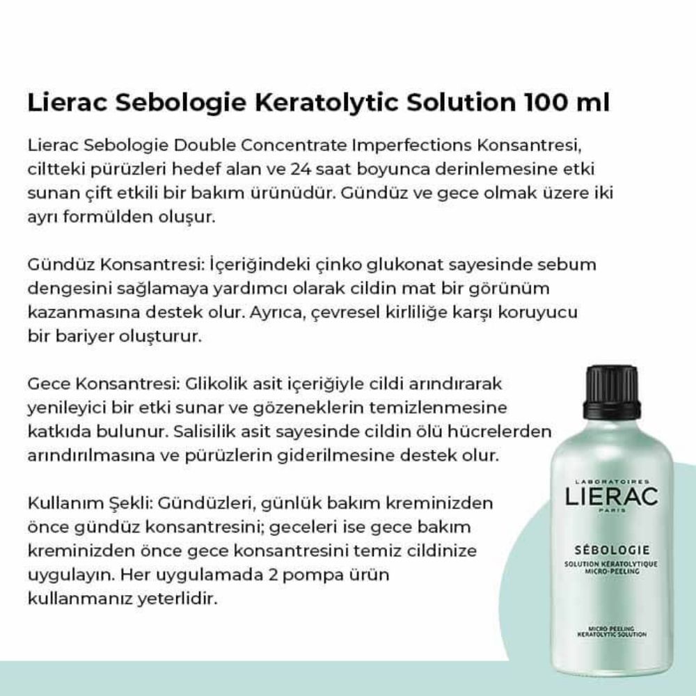 محلول ليراك سيبولوجي كيراتوليتيك هو لوشن علاجي منقي مصمم لتقليل الشوائب، وتنعيم ملمس البشرة، وتنقية المسام. يحتوي على حمض الساليسيليك، وجلوكونات الزنك، وحمض الجليكوليك، وينظم إفراز الدهون مع تعزيز تقشير لطيف. يساعد هذا المحلول على استهداف الرؤوس السوداء، والبقع، واللمعان الزائد، ليمنح البشرة مظهرًا أكثر نقاءً ونعومة وتوازنًا.
