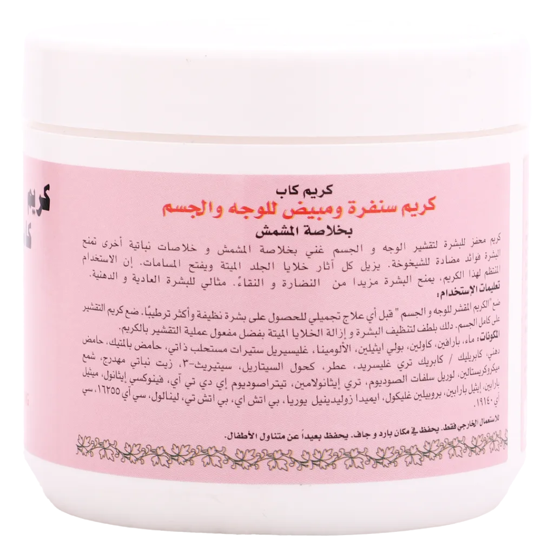 كريم كاب مقشر الوجه والجسم بالمشمش ٥٠٠ مل، مقشر فاخر غني بمستخلص المشمش، والصبار، وفيتامين هـ، مصمم لتنظيف البشرة وتجديدها وتنشيطها. تركيبته اللطيفة والفعالة تزيل الشوائب، وتنعم البشرة الخشنة، وتعزز إشراقتها الطبيعية، تاركةً البشرة ناعمة ومشرقة ومنتعشة. مثالي لجميع أنواع البشرة، ويدعم صحة البشرة ونضارتها وإشراقتها بشكل ملحوظ.