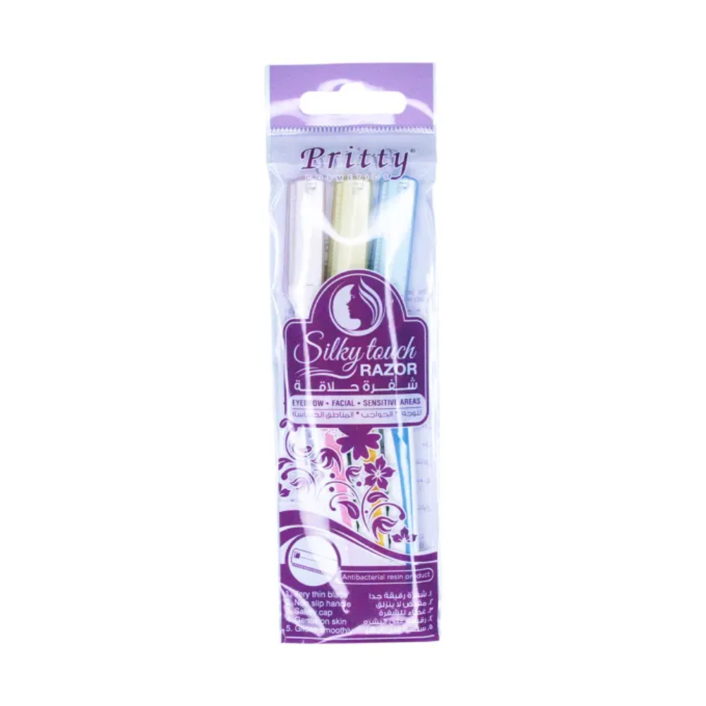 مجموعة بريتي سيلكي تاتش، 3 قطع، لشفرات الحلاقة الدقيقة، مصممة لإزالة الشعر بأمان وراحة على البشرة الحساسة. تصميمها المريح يضمن حلاقة متساوية، تاركةً بشرة ناعمة كالحرير.