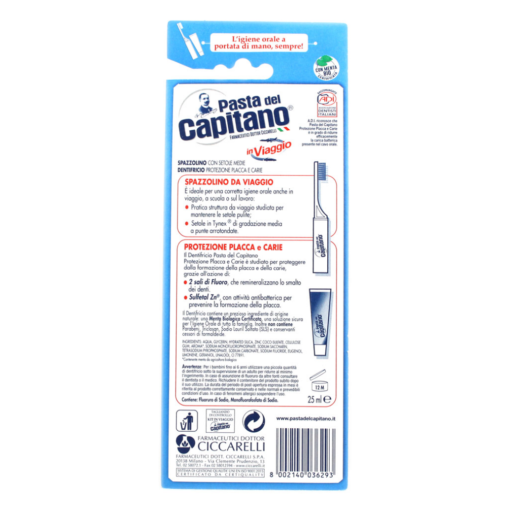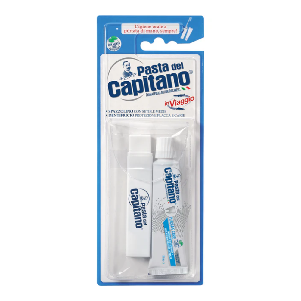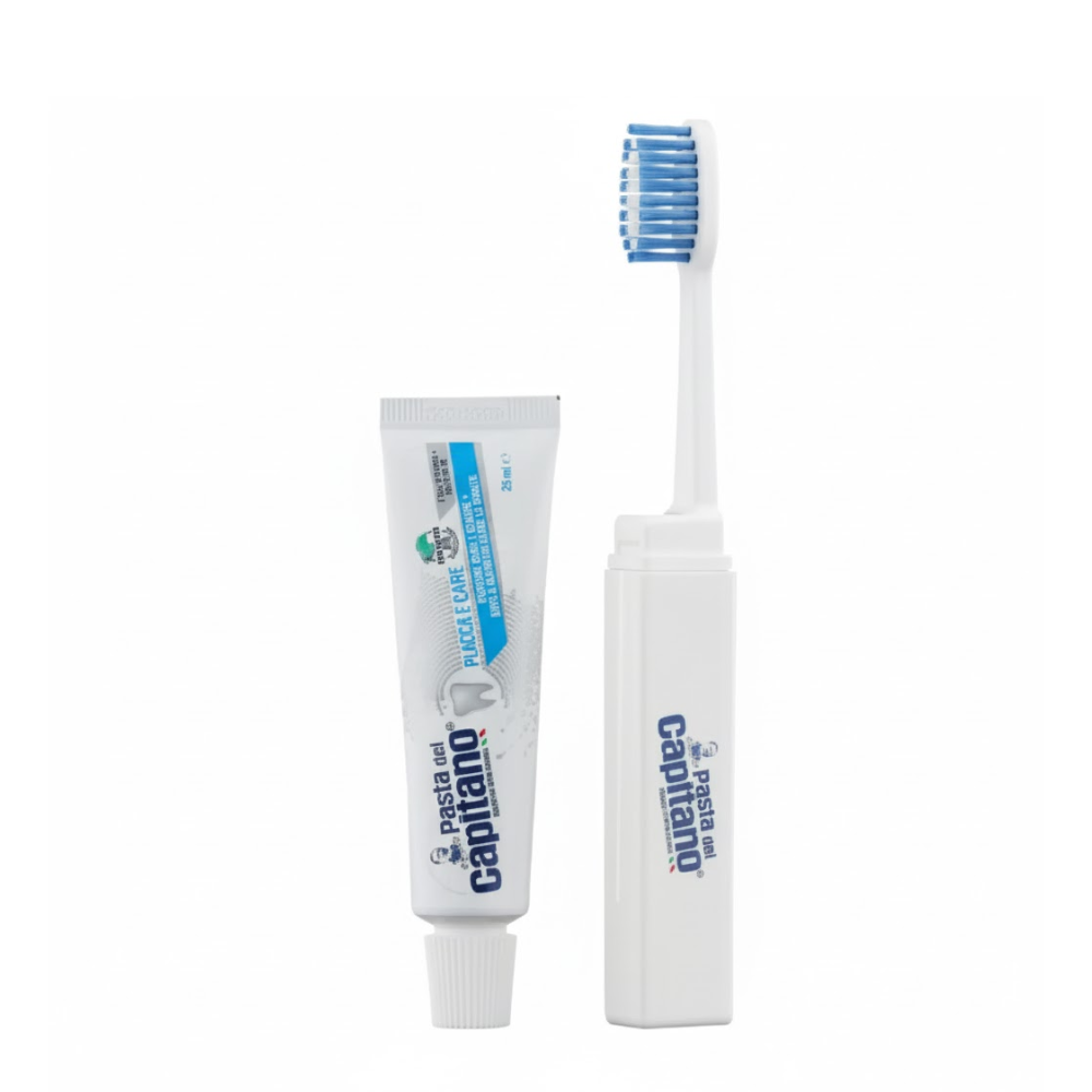 مجموعة باستا ديل كابيتانو للسفر هي مجموعة متكاملة للعناية بالفم، مصممة للسفر والعمل وحقائب الرياضة والعطلات، وتوفر منتجات أساسية تضمن نظافة تامة بعيدًا عن المنزل. تتضمن المجموعة عادةً فرشاة أسنان صغيرة الحجم ومعجون أسنان في حقيبة سفر صحية، مما يساعد المستخدمين على الحفاظ على انتعاش أنفاسهم والتحكم في تراكم البلاك أينما كانوا. بفضل تصميمها الخفيف والمنظم، تضمن هذه المجموعة فمًا نظيفًا وابتسامة واثقة، وروتينًا سهلًا للعناية بالفم حتى في أوقات العمل المزدحمة والرحلات الطويلة.