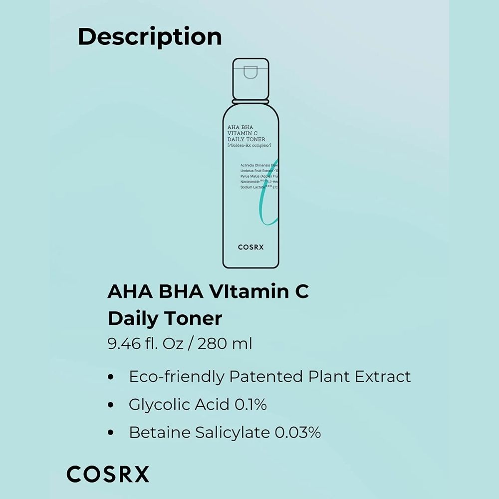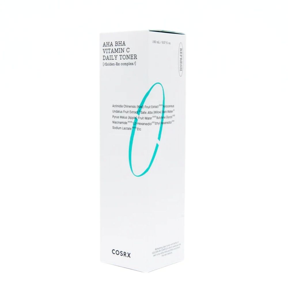 A revitalizing daily toner that combines gentle exfoliants—AHA (glycolic acid), BHA (betaine salicylate), and vitamin C (ascorbyl glucoside)—to improve skin texture, refine pores, and brighten tired, dull skin. The lightweight water-like formula absorbs instantly, sweeping away dead skin cells and clearing clogged pores while smoothing rough patches and evening out skin tone. Developed with COSRX's Golden-RX Complex™, featuring kiwi and pitaya (dragon fruit) extracts, this toner delivers antioxidant benefits to protect and energize the complexion. Enhanced with niacinamide, panthenol, allantoin, and adenosine, it helps soothe, boost elasticity, and support healthy skin barrier function. Suitable for all skin types, especially those seeking a radiant, clarified, and hydrated finish.