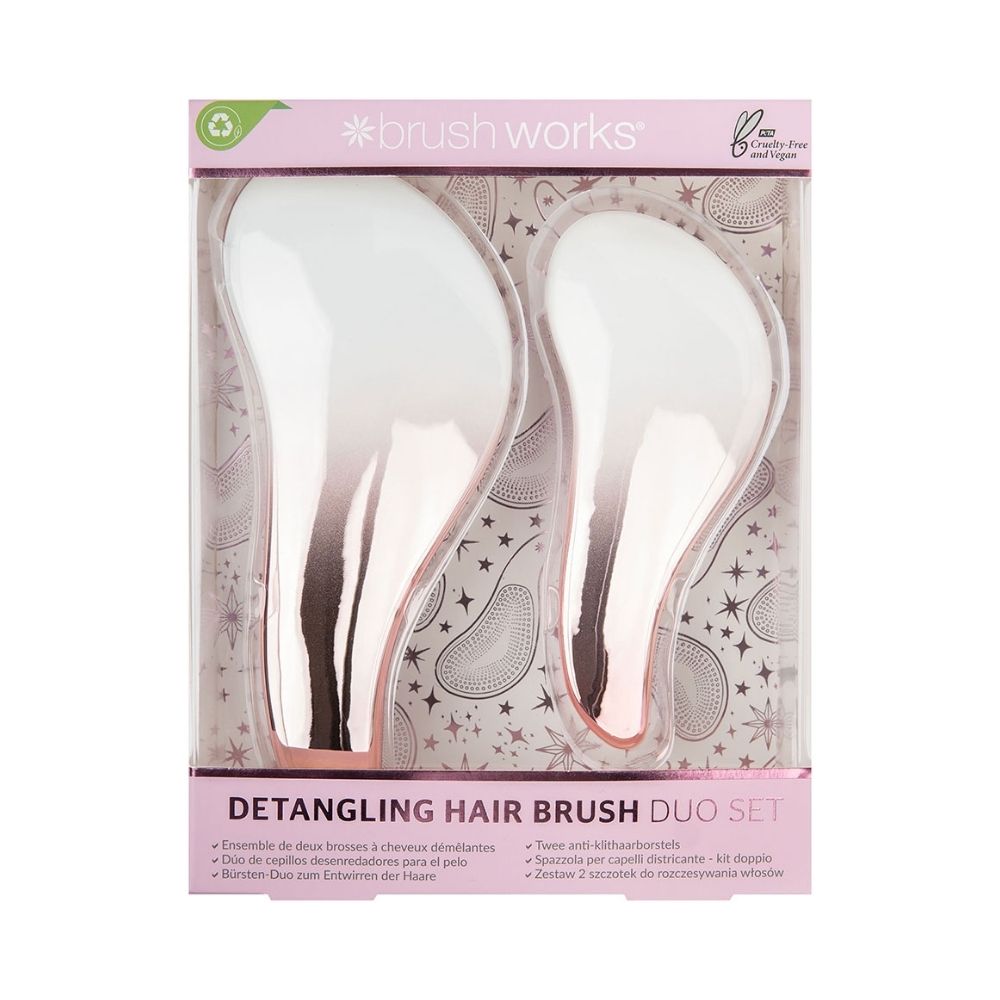 Brushworks Detangling Hair Brush Duo Set is a versatile hair care set including two brushes designed to remove knots and tangles gently. Brushworks Detangling Hair Brush Duo Set features flexible bristles that minimize breakage and hair damage while improving manageability. Regular use leaves hair smooth, soft, and easy to style. The ergonomic handles provide comfortable grip and control. The duo set ensures effective detangling for all hair types.