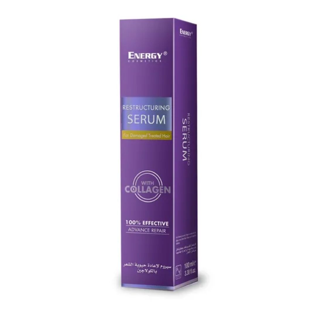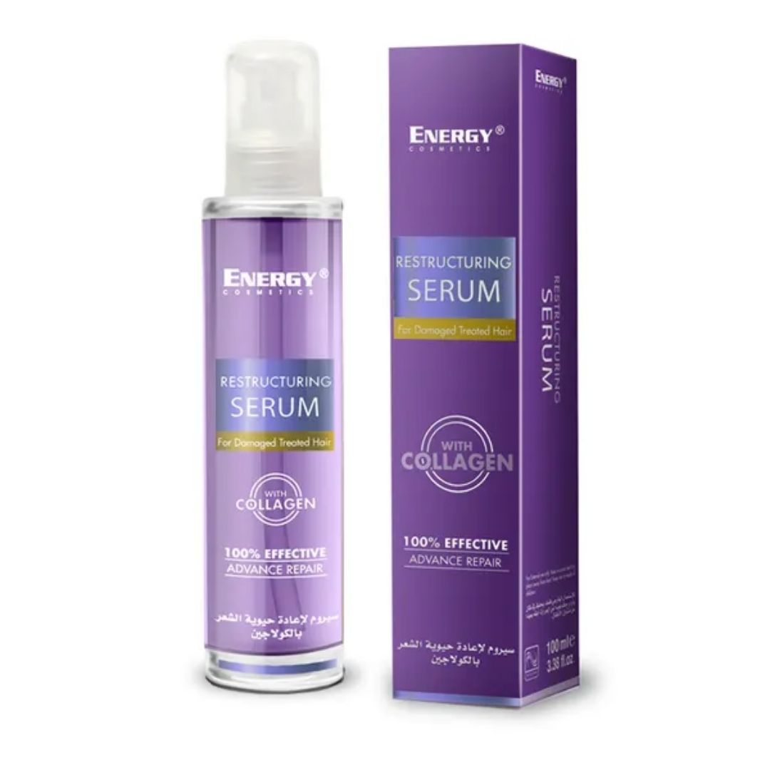 Energy Hair Serum Restruct with Collagen 100ml offers the same powerful restorative benefits as the 60ml version, providing deep nourishment for damaged or chemically treated hair. Its active ingredients, including Hydrolyzed Collagen, Argan Oil, and Vitamin E, repair, strengthen, and moisturize hair while enhancing shine, softness, and flexibility. Hair appears revitalized, healthy, and protected against environmental stressors.