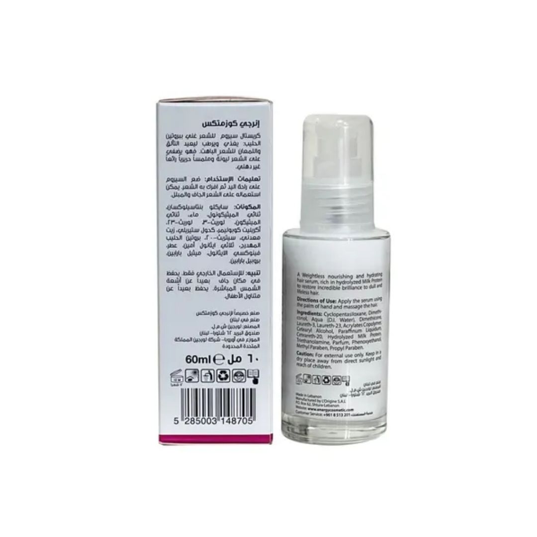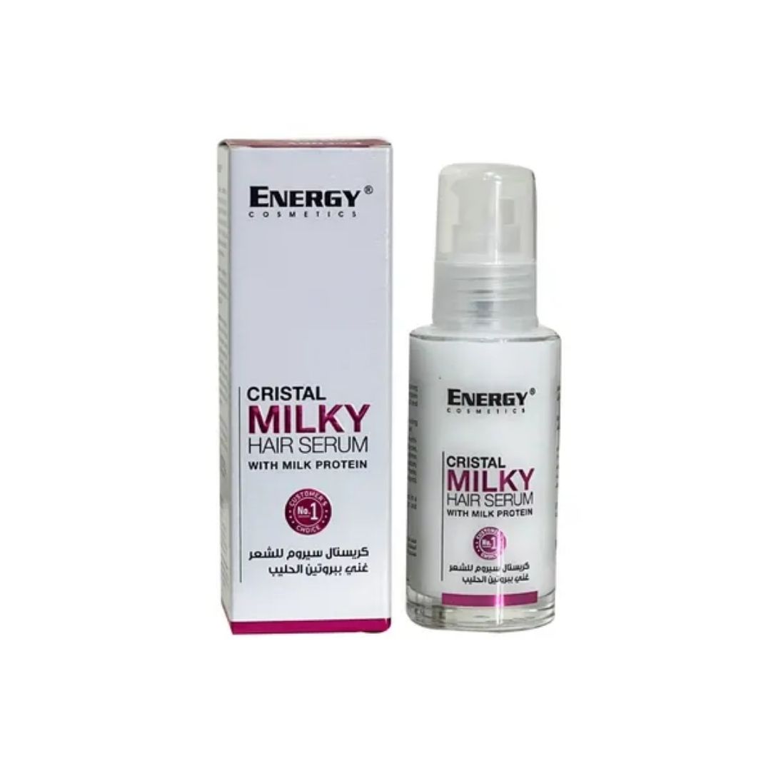 Energy Cristal Hair Serum Milky 60ml provides the same intensive restorative benefits as the 100ml version in a compact size. Formulated with Argan Oil, Hydrolyzed Silk Protein, and Vitamin E, it deeply nourishes hair, smooths frizz, and strengthens strands while adding shine and manageability. Hair appears soft, healthy, and polished with improved texture, resilience, and long-lasting hydration.