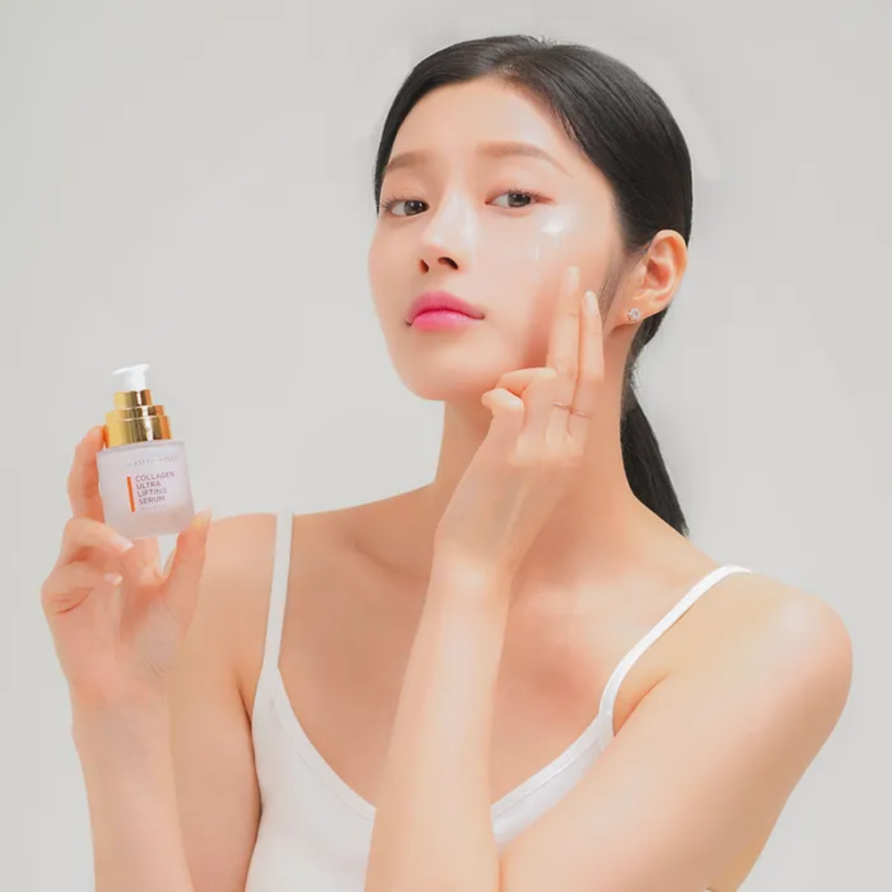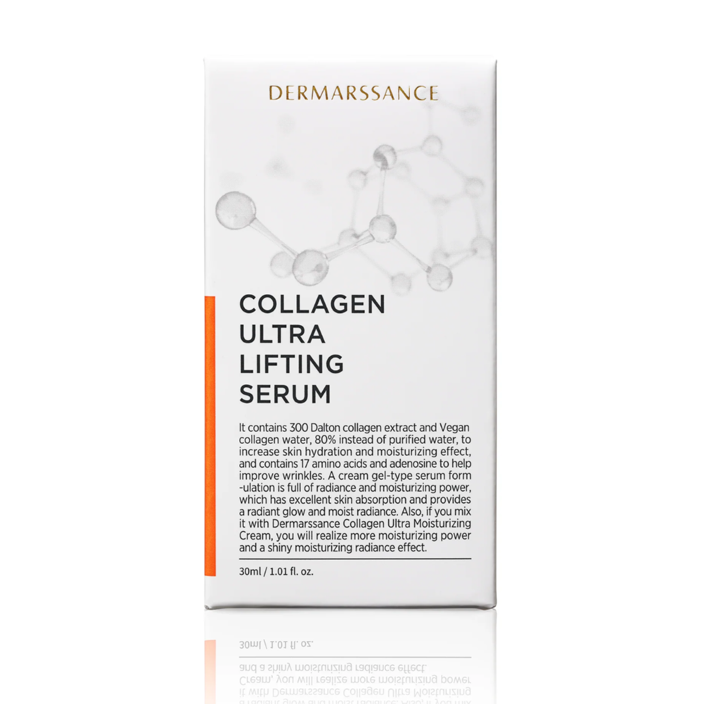 Dermarssance Collagen Ultra Lifting Serum (30ml) is a potent anti-aging serum formulated to lift, firm, and smooth the skin with a concentrated blend of collagen, peptides, adenosine, and niacinamide. It penetrates deep into the skin to promote collagen synthesis, improving elasticity and reducing visible wrinkles. The silky texture glides on effortlessly, providing instant hydration and a tightening effect that enhances facial contours. Over time, it restores bounce and resilience, giving the skin a visibly firmer and more sculpted appearance. With continued use, Dermarssance Collagen Ultra Lifting Serum leaves the complexion radiant, youthful, and full of life.