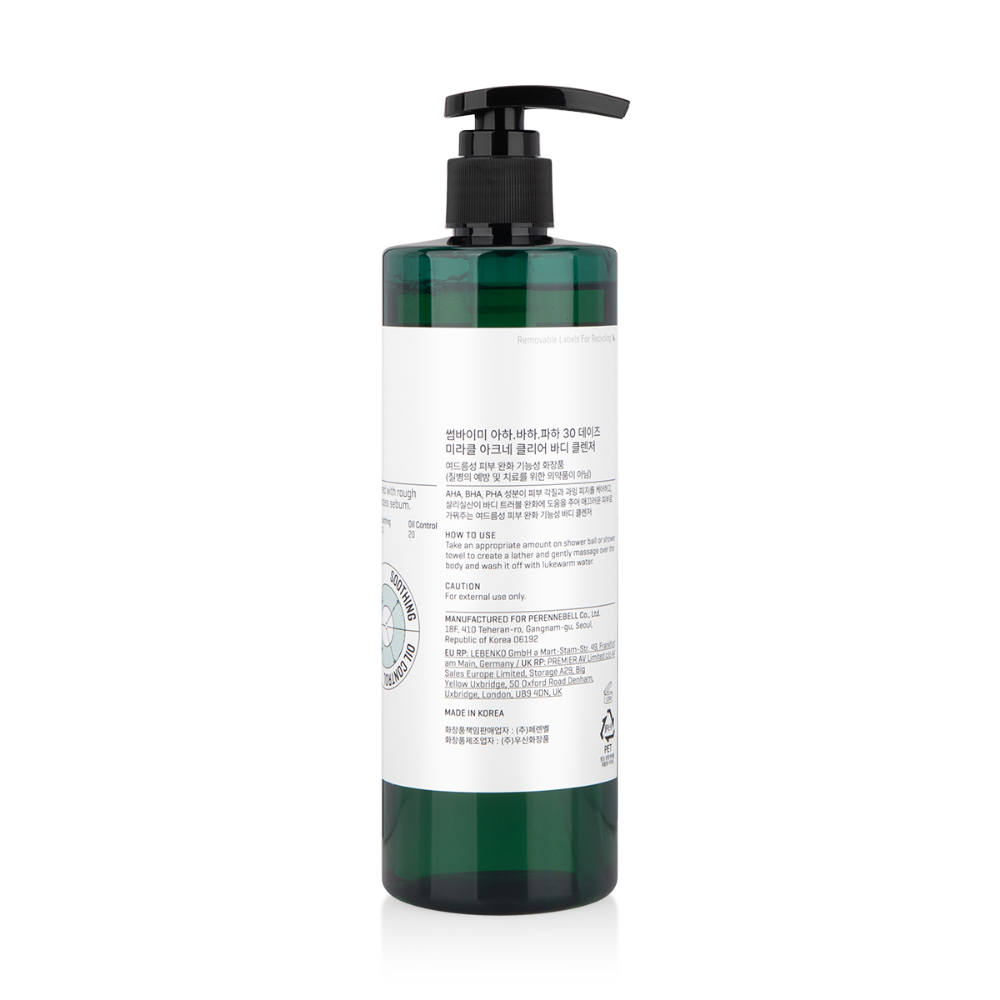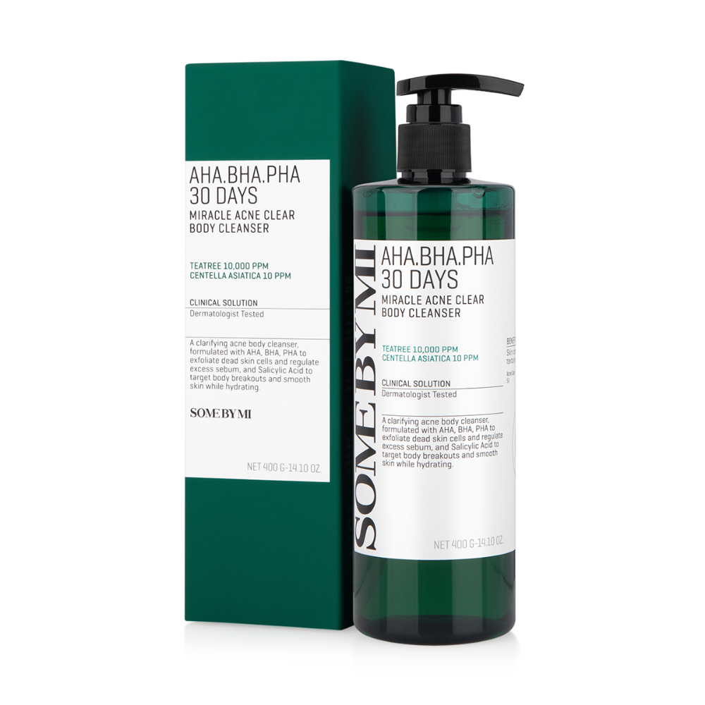Some By Mi AHA-BHA-PHA 30 Days Miracle Acne Clear Body Cleanser is a clarifying body wash formulated with AHA, BHA and PHA to exfoliate dead skin cells, clear clogged pores and target body acne on areas like the back, shoulders and chest. Infused with tea tree extract and soothing botanicals, it helps calm redness, reduce breakouts and balance excess oil while maintaining skin moisture for a healthier appearance. The refreshing gel texture works to improve rough bumps and blemishes, promoting smoother, clearer and more even-looking skin with continuous use, leaving the body purified, refined and visibly clarified.