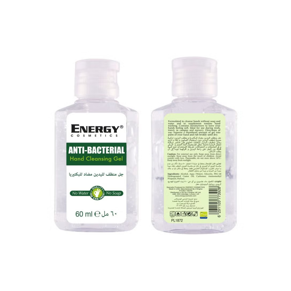 Energy Hand Sanitizer Gel 60ml is an alcohol-based hand gel formulated to kill 99.9% of germs while moisturizing the skin. Containing Ethyl Alcohol 70% v/v, Glycerin, and Aloe Vera Extract, it cleanses effectively without leaving hands dry or sticky. Perfect for on-the-go hygiene, it provides protection, softens skin, and leaves hands feeling fresh, smooth, and healthy.