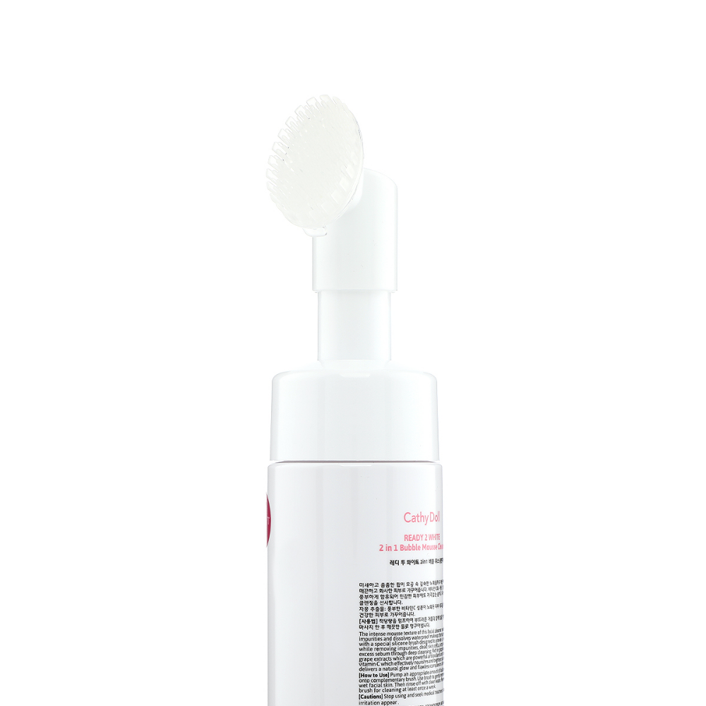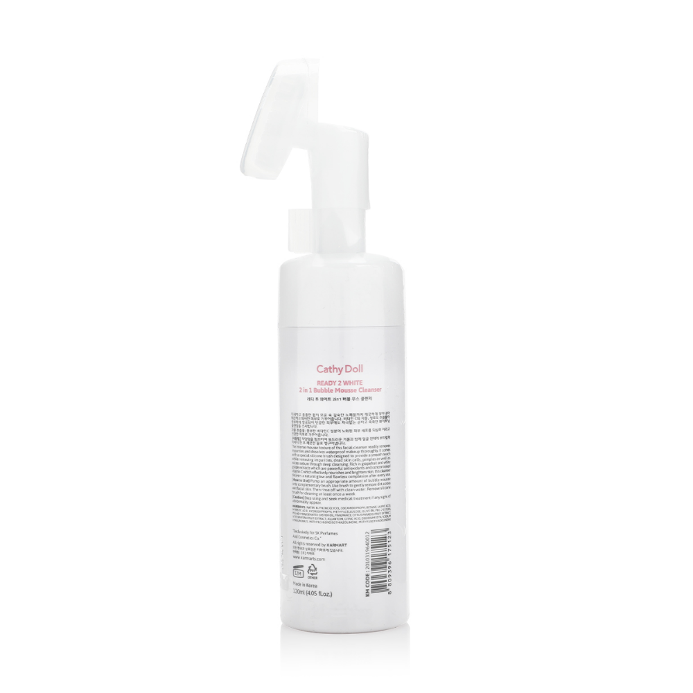 Cathy Doll Ready 2 White 2in1 Bubble Mousse Cleanser (120ml) is a gentle yet effective cleanser that combines exfoliating and brightening properties in a fun bubbly mousse texture. Enriched with L-Glutathione for skin brightening, Hyaluronic Acid for deep hydration, and Vitamin C for antioxidant protection, it helps remove impurities, excess oil, and dead skin cells while maintaining skin moisture balance. Botanical extracts like Aloe Vera and Chamomile soothe and calm the skin, leaving it refreshed, radiant, and soft without any tightness or dryness. Ingredients include L-Glutathione, Sodium Hyaluronate, Ascorbic Acid, Aloe Barbadensis Leaf Extract, Chamomilla Recutita (Matricaria) Flower Extract, Glycerin, and Cocamidopropyl Betaine.