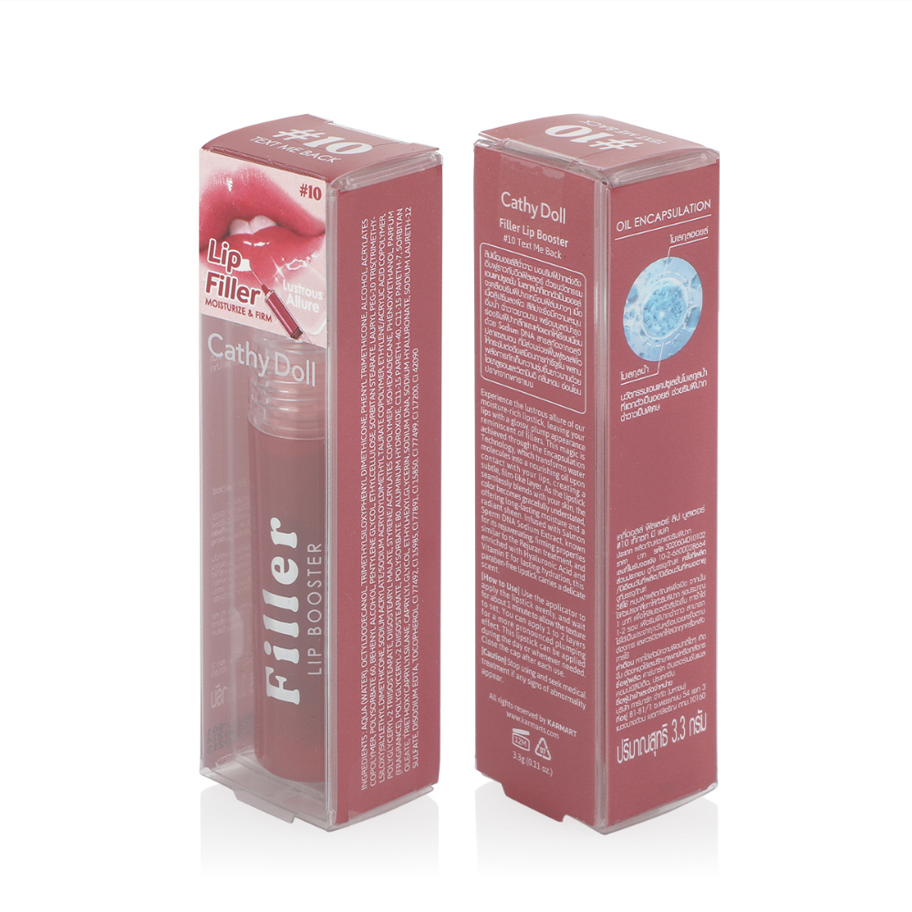 Cathy Doll Filler Lip Booster-10 Text Me Back is a volumizing lip booster that hydrates, smooths, and enhances natural lip contours for a plump, youthful appearance. Its advanced formulation includes Hyaluronic Acid for intensive hydration, Collagen Peptides to support elasticity, and nourishing oils such as Almond and Avocado Oil to keep lips soft and supple. Antioxidants like Vitamin E provide protection against environmental stressors, while the lightweight, non-sticky texture ensures effortless application and a radiant, natural finish. Key ingredients include Hyaluronic Acid, Collagen Peptides, Prunus Amygdalus Dulcis (Almond) Oil, Persea Gratissima (Avocado) Oil, and Tocopheryl Acetate.