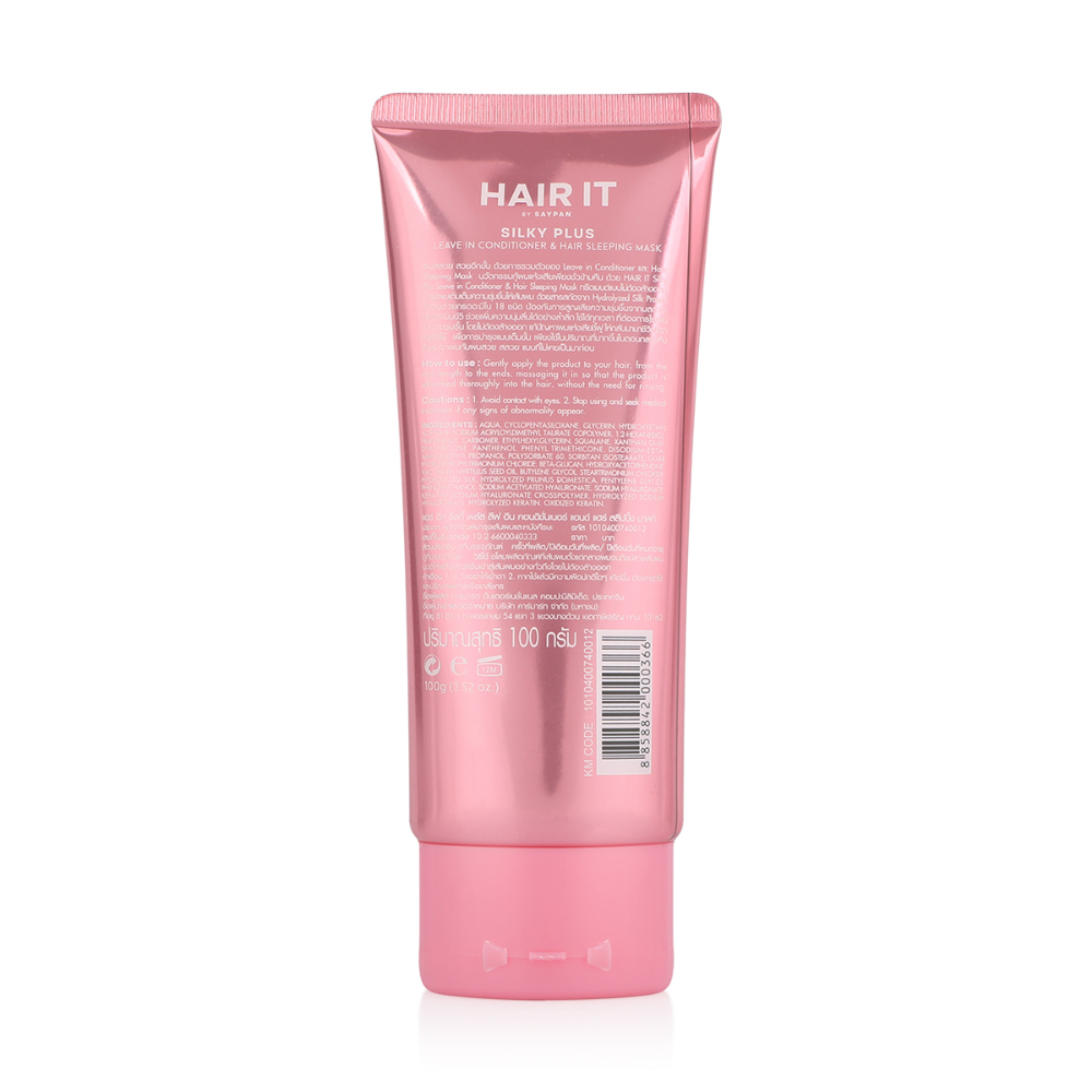 Hair It Silky Plus Leave In Conditioner & Hair Sleeping Mask (100g) is a dual-action formula that deeply nourishes and repairs hair while providing long-lasting hydration and smoothness. Enriched with Hydrolyzed Keratin to restore hair’s natural strength, Silk Amino Acids to improve elasticity, and botanical oils like Argan and Jojoba to lock in moisture, it tames frizz and adds shine without weighing hair down. Ideal for overnight treatment or daily leave-in use, it penetrates the hair shaft to repair damage, leaving strands soft, manageable, and resilient. Key ingredients include Hydrolyzed Keratin, Silk Amino Acids, Argania Spinosa Kernel Oil, Simmondsia Chinensis (Jojoba) Seed Oil, Aloe Barbadensis Leaf Extract, and Glycerin.